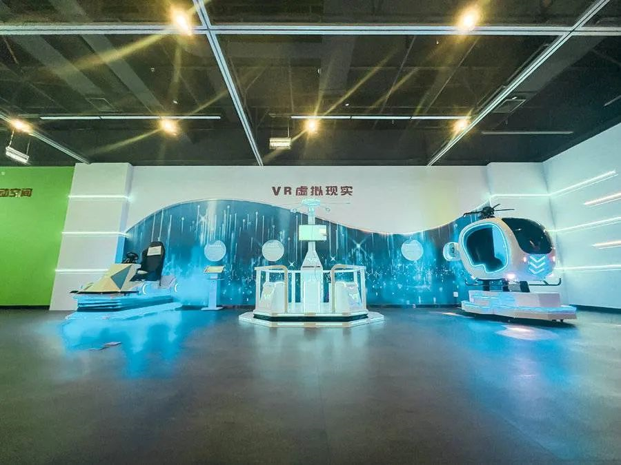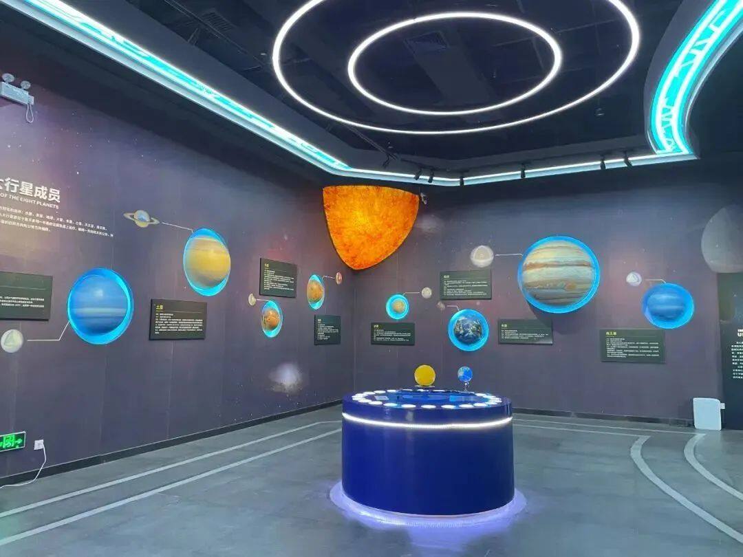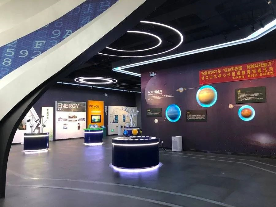 东源县科技馆主建筑为一层,共分为七个展厅,主要包括神秘宇宙、生态城市、绿色东源、智慧生活、元宇宙体验厅、儿童科普DIY和电影室、馆外延伸临展长廊。