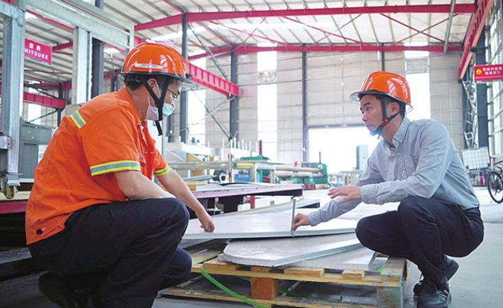 廖东帆(右)走访生产车间,确保各环节无纰漏。 记者 殷鑫 摄